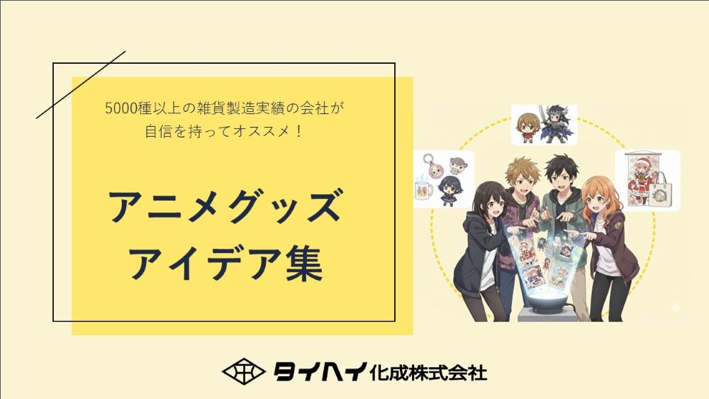 5000種以上の雑貨OEMに携わってきたタイヘイ化成のアニメ業界グッズのアイデアや関連情報を事例紹介とともにまとめています。