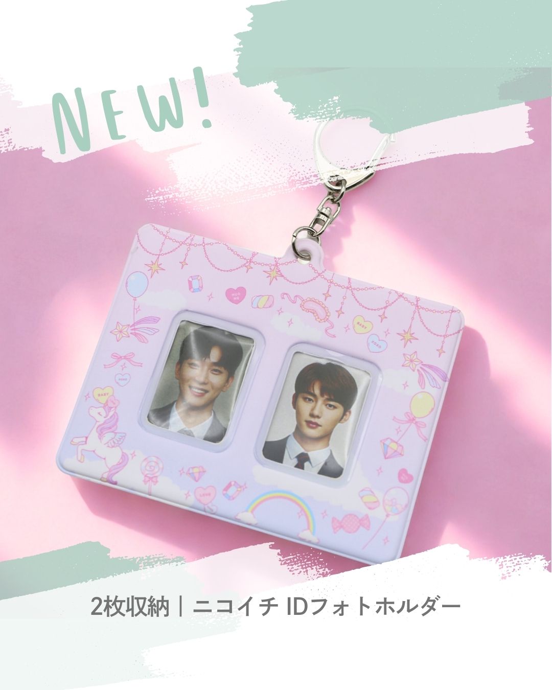 「ニコイチ(2枚収納)」仕様で、ペア・ユニット・カップリングなどの推し活需要にフィット。小ロット対応で、オリジナルキャラクターグッズ・アイドル/アーティスト・スポーツライセンスグッズにもおすすめです。